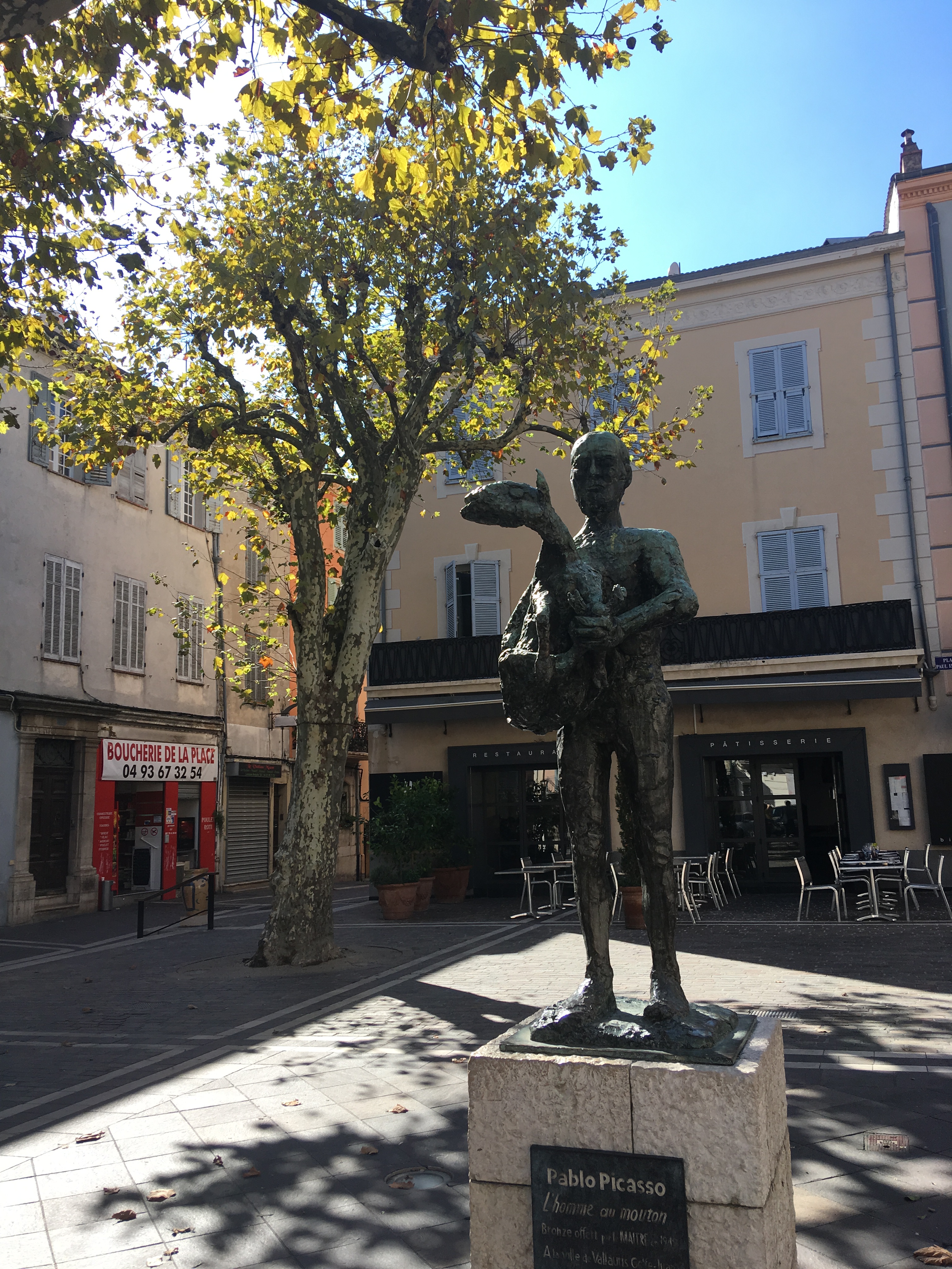 Following Antibes, we made the short drive to Vallauris, a town historically known for its pottery. While Antibes is a tourist town, Vallauris is a bit farther from the sea and a little quieter. Picasso fell in love with Vallauris and lived there as well for a time. During that time, about 70% of the population were potters, and the town had fallen on hard times due to the mass production of kitchenware. Picasso, who loved painting on and playing with the clay essentially revived the industry. Though he started out just tinkering with pre-made pieces, he also learned the process of making his own pieces. In total, he made 4000, and still owned 3000 when he died – meaning there were 3000 pieces he didn’t want to part with. He left behind two very famous works in Vallauris, first War and Peace, a piece in which he painted the interior of a 14th century chapel. Pictures of the chapel aren’t allowed, but it’s amazing. His other work in Vallauris (besides all the pottery displayed in the museum) is Man with Sheep, a bronze sculpture to symbolize peace following the end of the war.