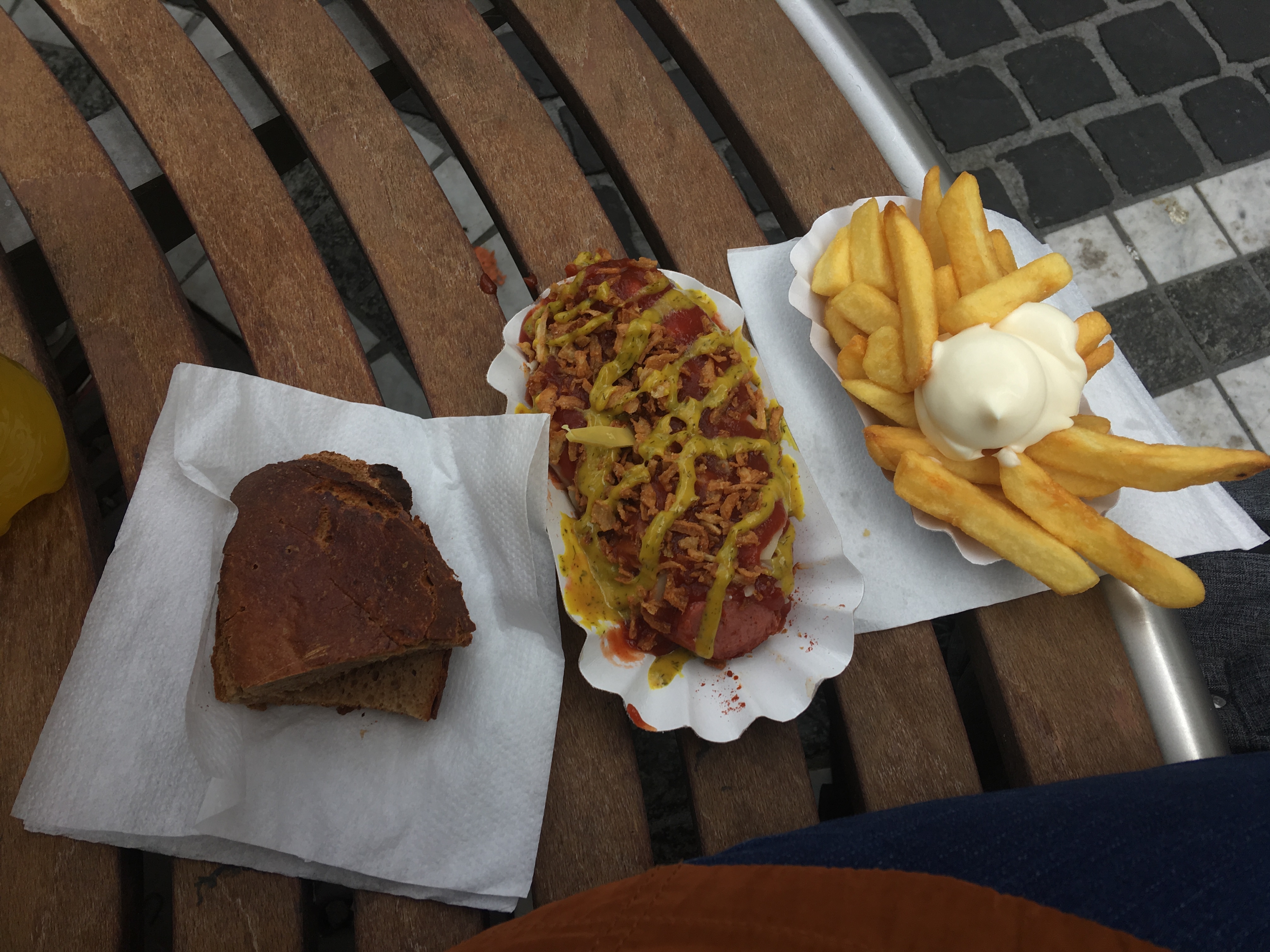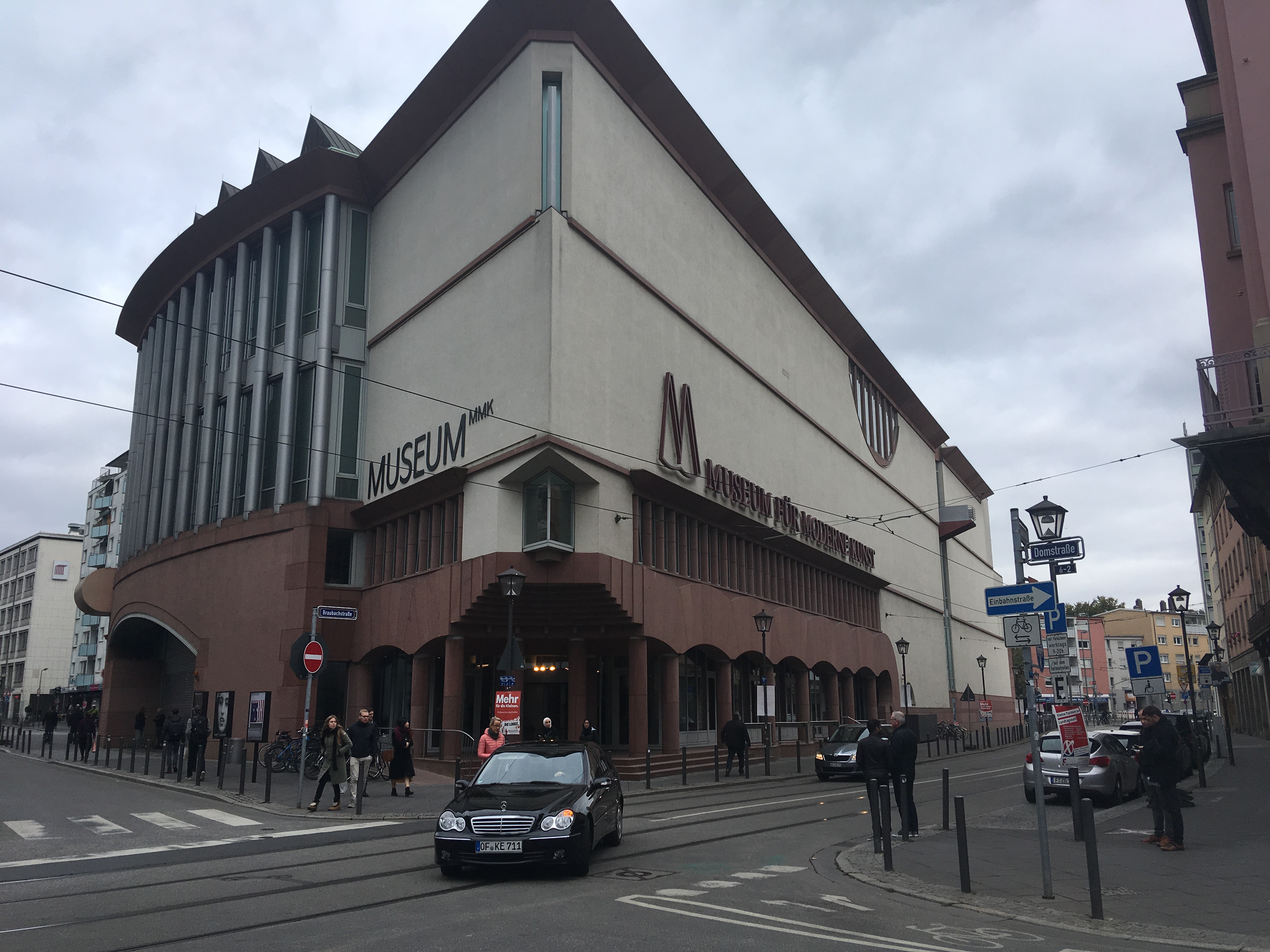 I started out by flying into Frankfurt on a chilly Saturday morning that made me question my wardrobe choices. I’d brought sweaters, but I was not warm enough in them. Fortunately, Frankfurt has some very good currywurst – essentially a hot dog (beef or pork) topped with ketchup and either curry sauce or curry powder. I had one for lunch on both Saturday and Sunday, and both were delicious and warmed me up. While in Frankfurt, I was on my own, so I had plenty of free time to do whatever I wanted, such as spending time in the modern art museum and people-watching at the Römerberg. Sunday was even colder than Saturday, so although I hadn’t planned to buy souvenirs in Frankfurt, I ended up with a hat that kept my head much warmer. I also took a bus tour around the city – partly so I wouldn’t have to walk to see all the cool architecture but also partly to be inside. Frankfurt is an amazing city for architecture though. Most of the city was destroyed in WWII, but rather than completely rebuilding in a modern style, they kept renovated many of the medieval buildings in addition to building skyscrapers and other modern buildings – like the art museum.