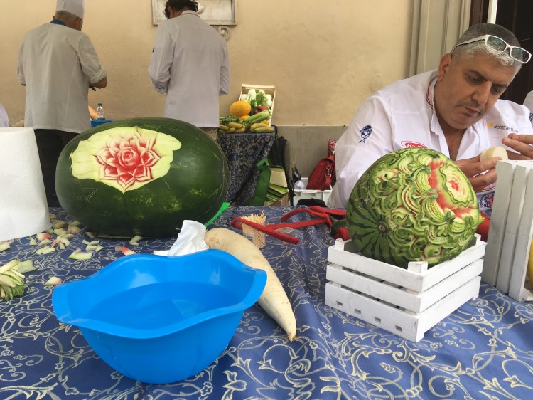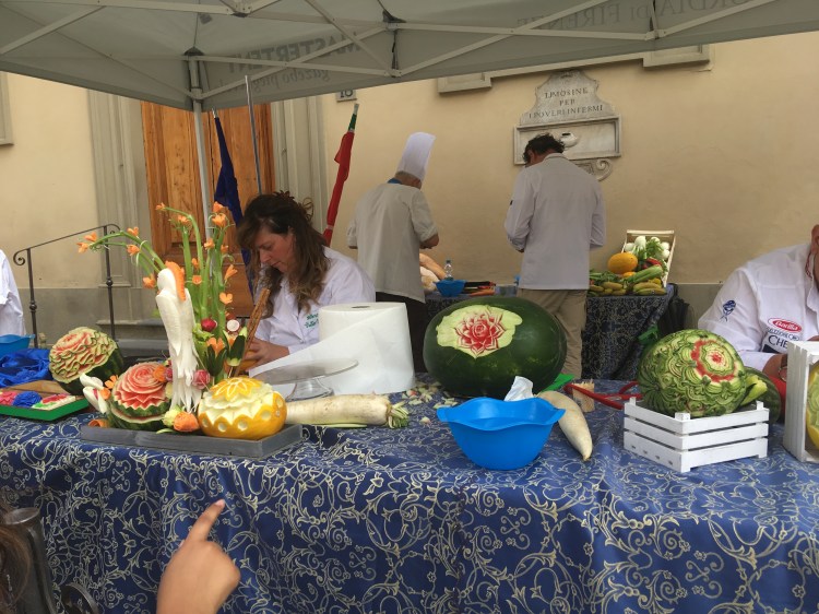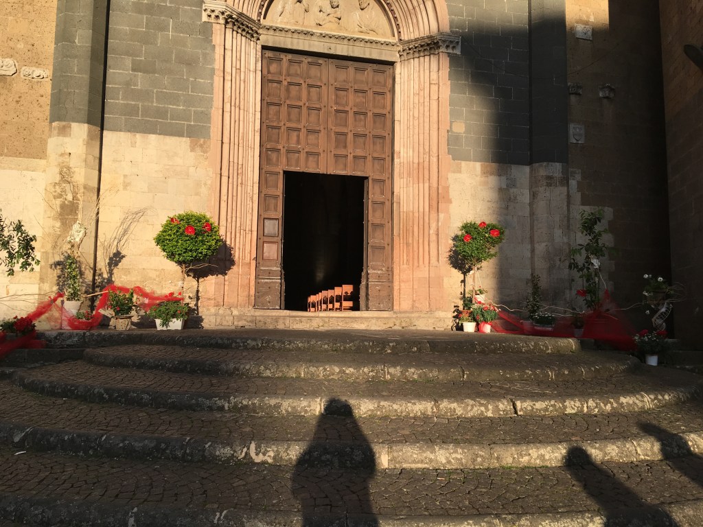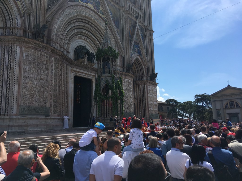 Last Sunday was Pentecost, which in Orvieto is celebrated with La Palombella festival. This is another draw for tourists to Orvieto both from Italy and around the world. The main part of the festival takes place in front of the cathedral. As visible in the above picture, there is a structure in front of the main doors. This is a baldachin (baldacchino in Italian), which is basically an elaborate canopy of sorts that goes over an altar or throne. The one here is temporary and was moved following the Pentecost celebrations. For the festival, a statue of Mary and the apostles was placed in the top portion of the baldachin, and on Sunday morning, a dove in a glass cage “floated” down a zip line into the same space at which point sparklers went off around the statue to symbolize the Holy Spirit. It was really exciting to watch. The whole day was taken up with celebrations and booths to buy flowers and such, but the day culminated in a parade and crossbow contest in one of the main piazzas. Everyone in the parade was dressed in medieval costume, and there were four teams in the crossbow competition to represent some of the ancient noble families of the region, who were also represented in the parade by people in costumes. The whole event was just a lot of fun, and I really enjoyed it!
