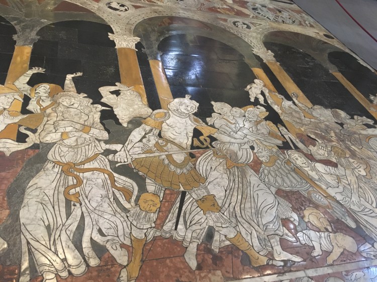 The cathedral in Siena is a Gothic masterpiece, and, like much of the rest of the town, is kind of like Medieval Europe with modern tourists. Although the outside is beautiful, the real wealth and fame of the cathedral come from its interior. Siena has the luck of being close to a lot of marble. While white marble is the most common, it’s actually yellow that is rarest and most expensive. The floors of Siena’s cathedral feature marble tiles in white, green, red, and yellow that depict Biblical scenes. These would have been used similarly to stained glass windows in illustrating the priest’s sermon, since almost all of the congregation would have been illiterate. My favorite part of the cathedral though was inside a chapel. Originally, a noble family who donated a lot of money to building the cathedral had this chapel for their private use, but now it’s used to house vellum choir books, under glass of course. I took some pictures, but they really can’t capture how cool these books were. All of them were illuminated, and they were much bigger than modern choir books since they would have been really expensive, and there was no way the church could afford one for each choir member. So, all in all, Siena is pretty neat.