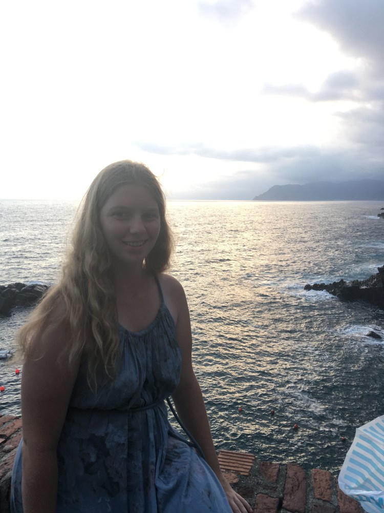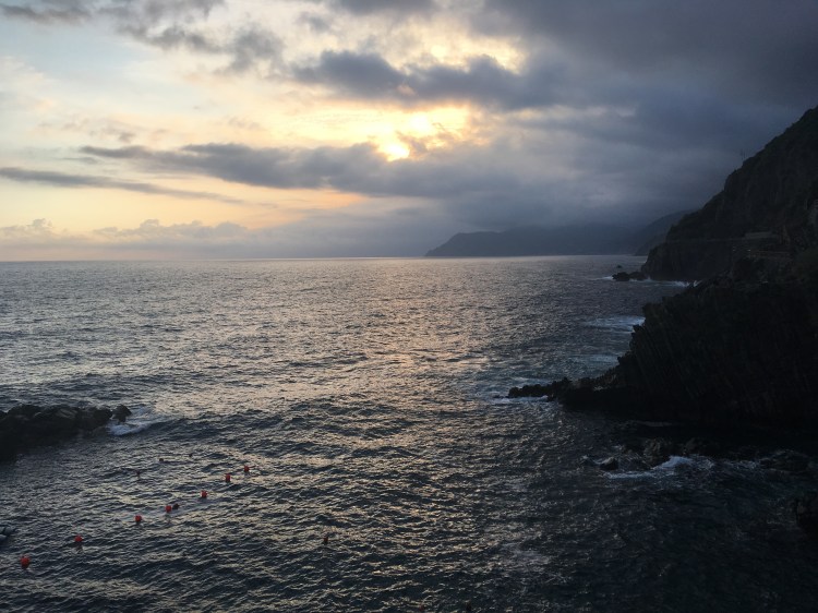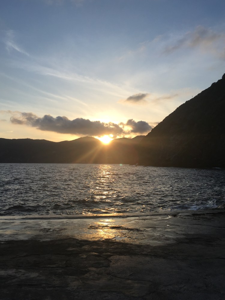 Vernazza may have been a random choice, but it’s easily my favorite. We arrived there around 5:30 and left at 10:30. Naturally, our first stop was the water. Vernazza isn’t known for its beach, but we weren’t dressed for the water anyway. Instead, we walked out along the sidewalk to smell the salt and take some pictures – and I also got splashed by some very cold spray from the waves. We wandered through some of the stores then hiked up a lot of stairs to this tower that overlooks the area. It was great weather and a great view, and by the time we came down, it was an acceptable time for dinner. As this was considered out vacation, we treated ourselves to some seafood pasta: Shrimp ravioli for me, and for my roommate, spaghetti with mussels and clams. Both were fantastic. Finally, we went back to the bay to eat gelato and watch the sunset before returning to La Spezia for the night.