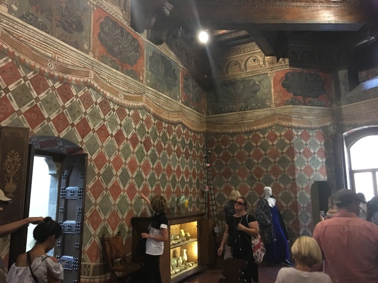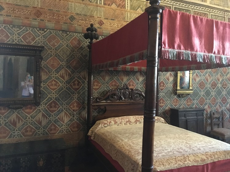 Florence though was spectacular. It feels kind of like an expanded small town. When you’re walking down the streets, there’s still a small town feel that you don’t get in Rome or Naples even though Florence is still one of Italy’s biggest cities. This is largely because it has held onto its Medeival/Renaissance past and lacks the wide boulevards that Mussolini installed in Rome. Looking across Florence, you can still see the old tower houses and the loggia built for the cloth markets of the Medici and today functioning as leather markets for all the tourists who come to see Florentine leather. We started our tour walking along the River Arno before turning onto a side street where we walked by Santa Croce (Holy Cross) and then on to a Proto-Renaissance palace that is now a museum of what everyday life was like back then. Some of the rooms retain original wall paintings, and all have either original or replica furniture and artwork to give you an idea of the sort of luxury enjoyed by the rich families of Florence. The artwork is especially interesting as you can see the transition into the Renaissance. On the top floor is the kitchen – in case a fire started, this way only the top floor would burn. It’s filled with the sorts of tools that would have been used and even features a huge bellows for the fireplace.