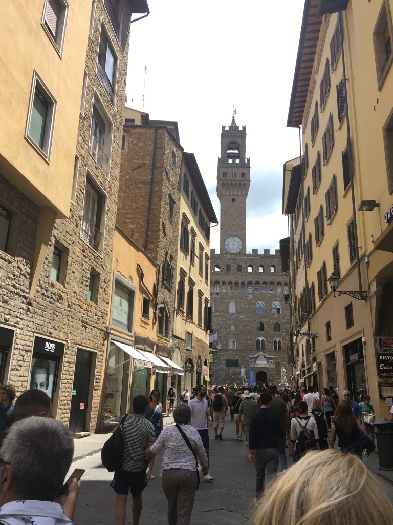 The group then walked through the interior plaza of the Uffizi Museum to the river and the Ponte Vecchio (old bridge) which is full of tourists and expensive jewelry stores. The bridge used to be where butchers sold their wares but with the rise of the Medici, some of the noble women complained about the smell. That’s why even today, only jewelry stores can operate on the bridge.