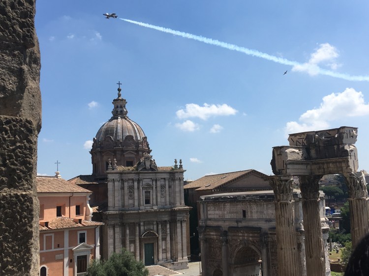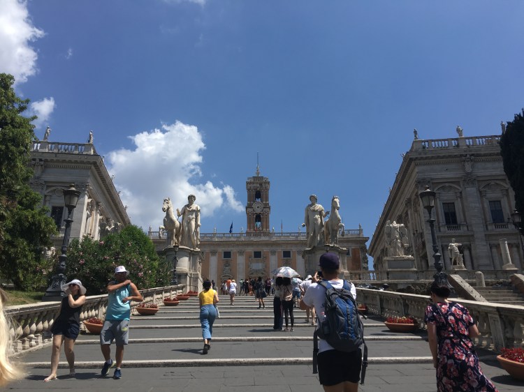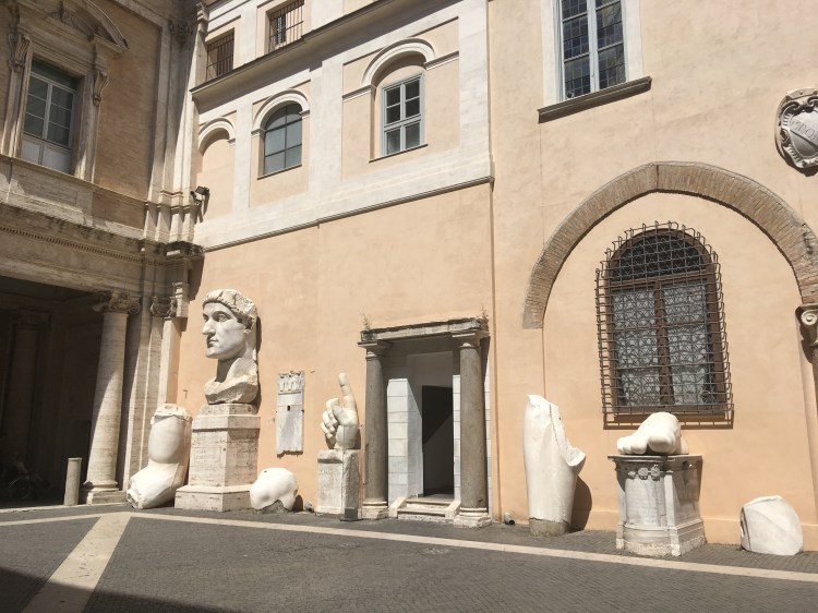 Starting with the Capitoline museums we took Rome’s history all the way to the beginning with the famous statue of Lupa Capitolina and the infant twins Romulus and Remus. The facade and piazza of the museums were designed by Michelangelo, with the intent that the buildings would function as a city hall. You climb a high flight of stairs to crest one of Rome’s fabled seven hills and are welcomed into a marble piazza all centered around Marcus Aurelius. This of course is a copy as the original resides within the museum, but it is still impressive. This marvel statue is one of the few remaining from antiquity; because early Christians believed it to be a statue of Constantine, they let it stand though today it’s been properly identified. Walking through the museums you pass innumerable treasures – pottery and marble busts, even the remains of a colossal statue of Constantine. As you pass through these ancient wonders though, nothing quite beats the view of the Forum. Here you stand on a brick walkway with massive arches to look over what was once downtown Rome.