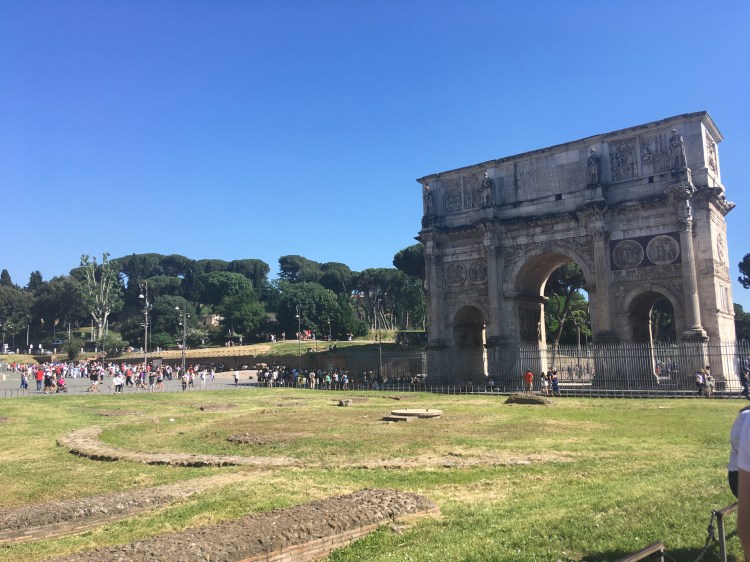 After lunch, we went to L’Archetto Pizzeria (above). It seems pointless to try and describe what it’s like to walk down the Via Sacra and gaze at massive arches and Julius Caesar’s deific memorial. There are three main arches in the forum and though each is magnificent, I love the engravings on the Arch of Titus which depicts the conquests of Rome. The sculpting here is a masterwork that shows just how well the ancients could ply marble. The figures are cut in close at the ends but come fully into the viewers space in the middle, and the image itself is of historical importance as it depicts the conquest of Jerusalem, represented by a menorah. The Arch of Constantine, while also lovely to see, provides a further step in the history of art. Here the figure have more similar features and are not nearly so three-dimensional. This was Roman denaturalization, the period in which the so-called Classical period began transitioning into the art we think of as medieval.