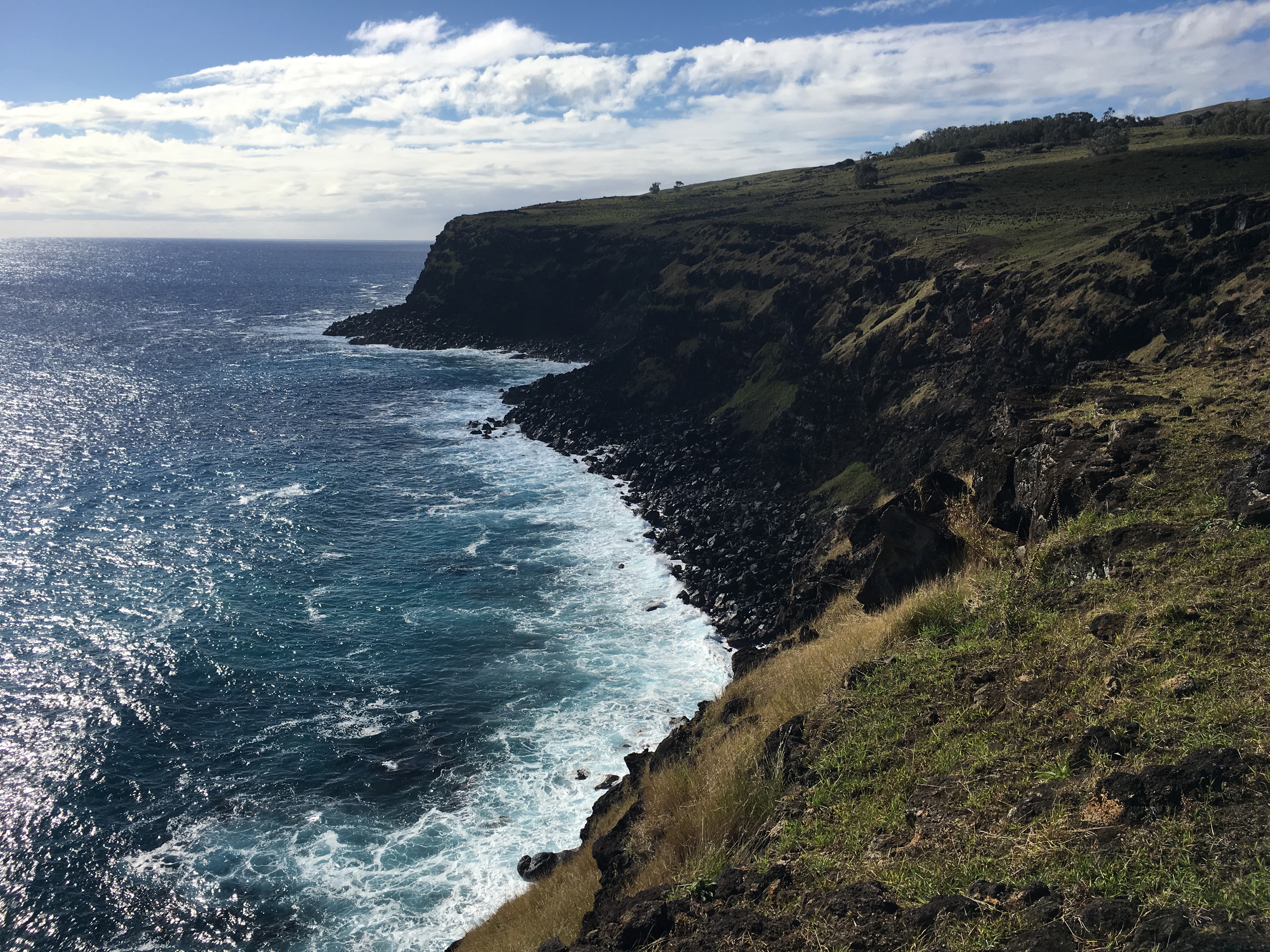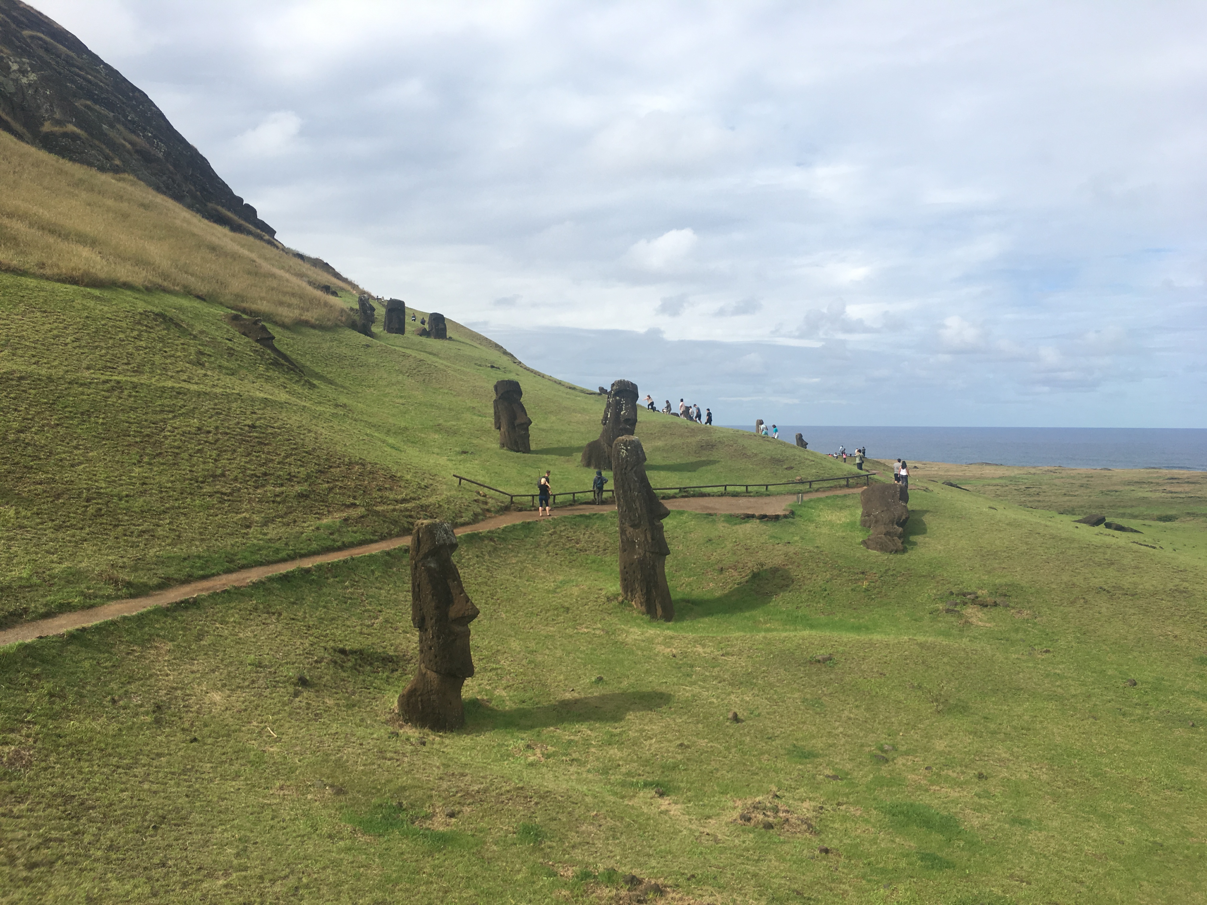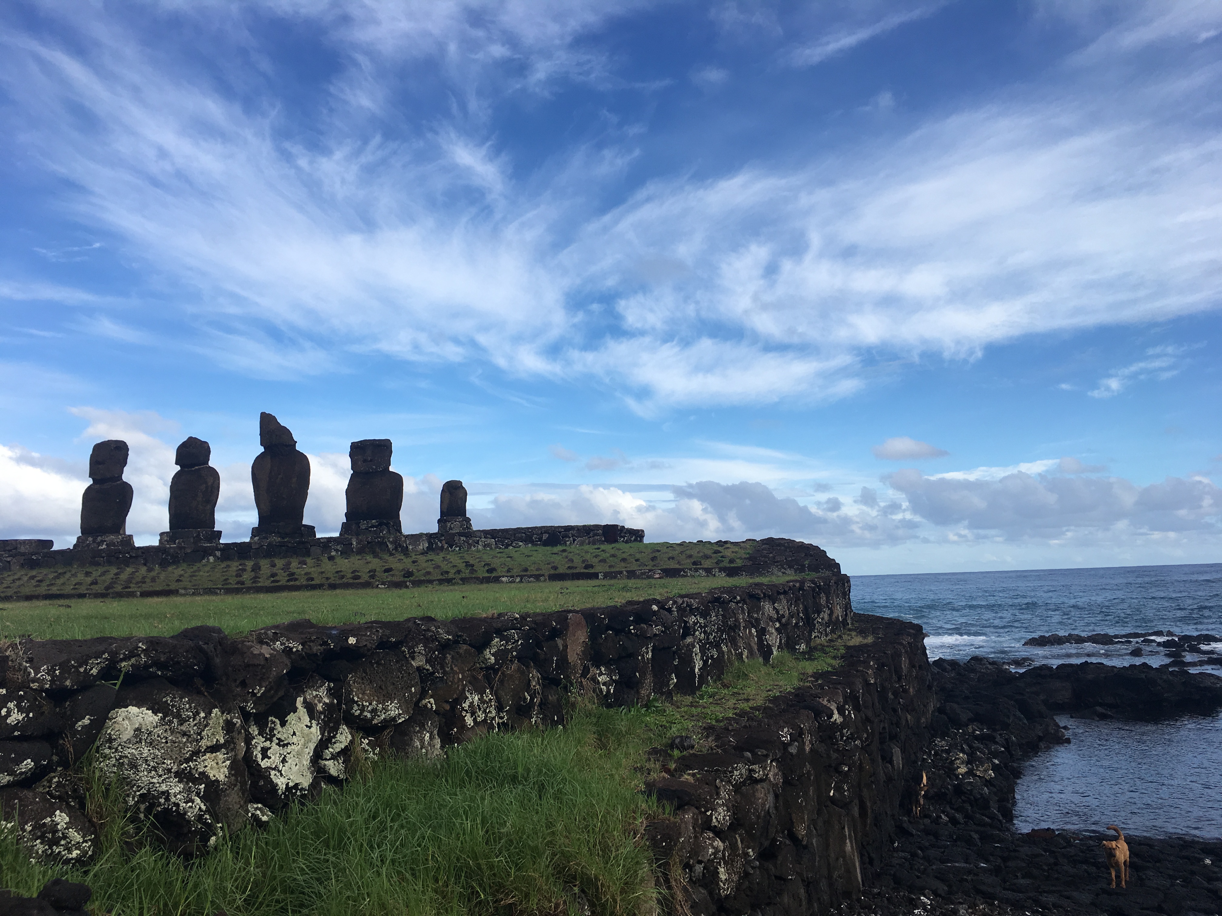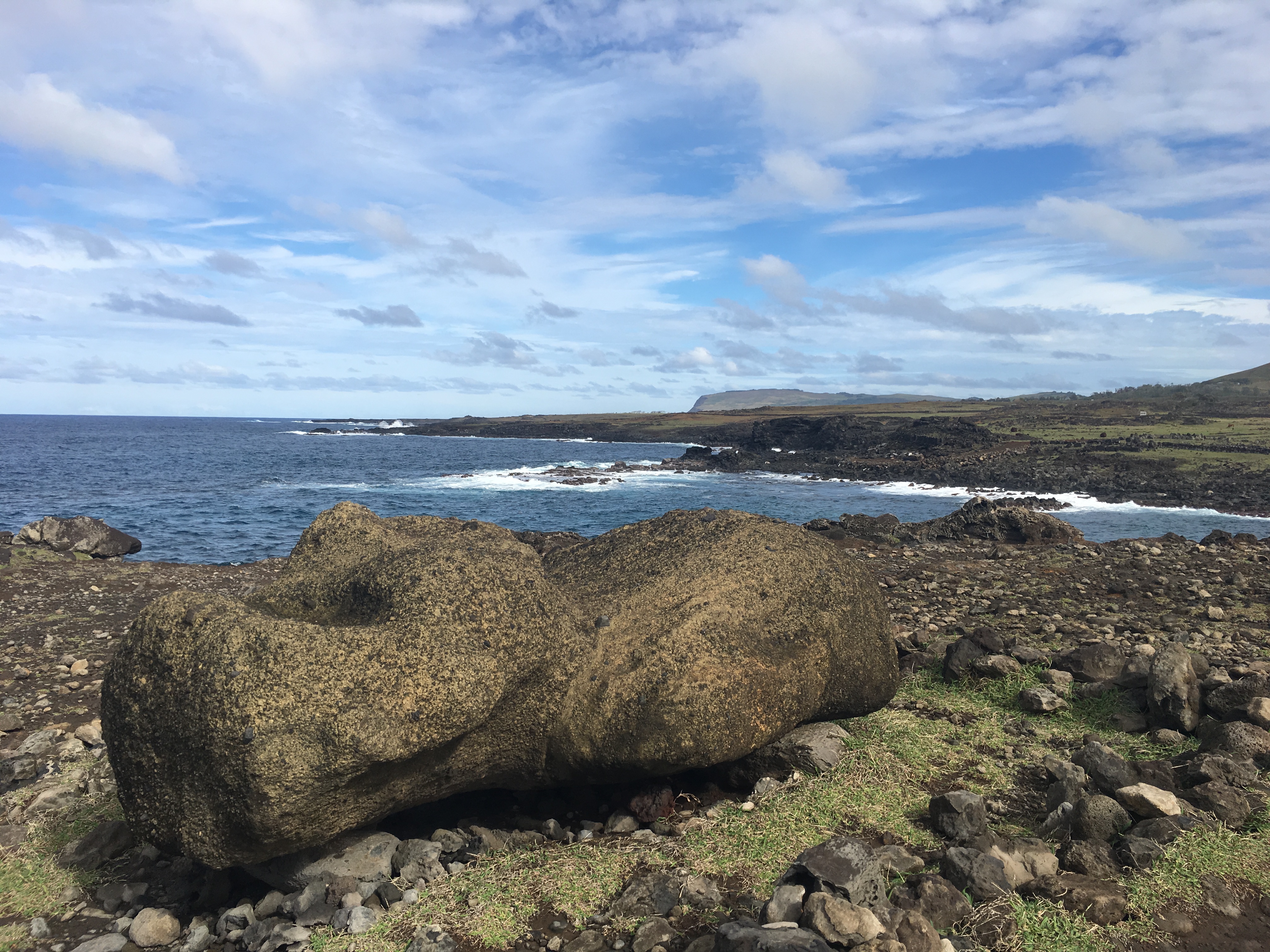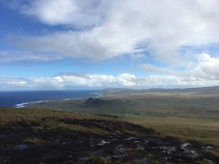 Easter Island is a world heritage site that now receives about 100,000 visitors per year. There have been proposals about limiting tourism, but, of course, this would also hurt the local economy. Besides that, there really is something marvelous about standing in front of these massive statues but crowds of people taking selfies can diminish that wonder a bit (further reading). Personally, my favorite parts of the trip were the moments without people. The big ahu (platform) Tongariki with its 15 moai is impressive, but I much preferred a rainy afternoon at Tahai where I could sit quietly without needing to take pictures and just think about the long history of the island and its people and the way history has moved all of us. I loved walking along the cliffs at Tepeu with just the rest of my group – five students and three actual adults – and marveling at the ruins of a settlement and its fallen moai, still breathtaking in front of an endless expanse of Pacific blue.