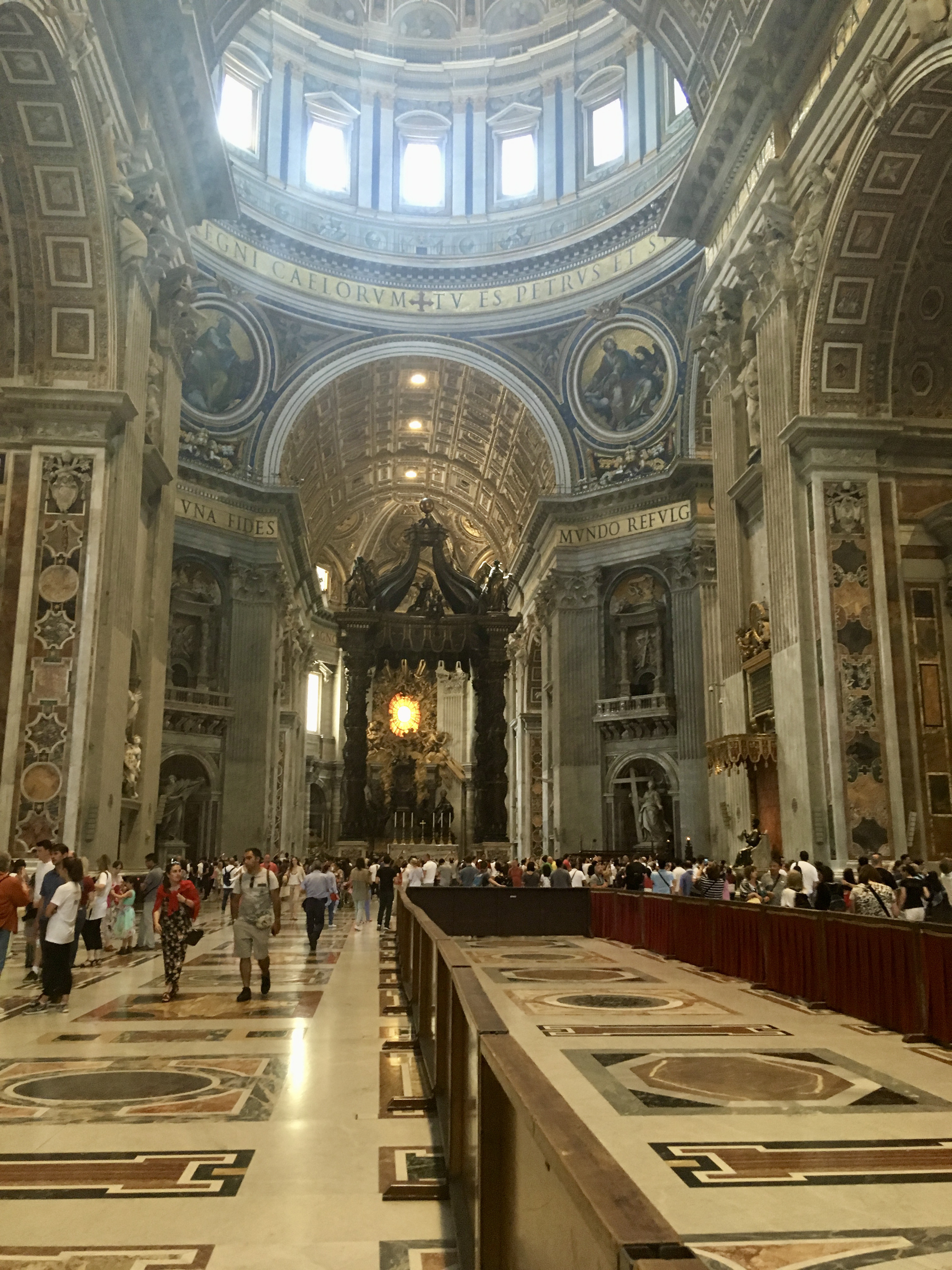 Before leaving the Vatican complex, don’t forget to visit St. Peter’s Basilica. This whole building is a work of art (I had read a book about the history right before coming, so I was thoroughly impressed to go inside and see everything I’d just learned about). The history of the building is fascinating, and you’ll see the different styles throughout. Michelangelo’s Pietà is stunning, so much so that I bought a touristy statue of this instead of the Colosseum. But the things you will notice first and most are Bernini’s Baroque additions – the massive Baldachin over the altar, and the chair of St. Peter, which, surrounded in gold, appears to be ascending into heaven.