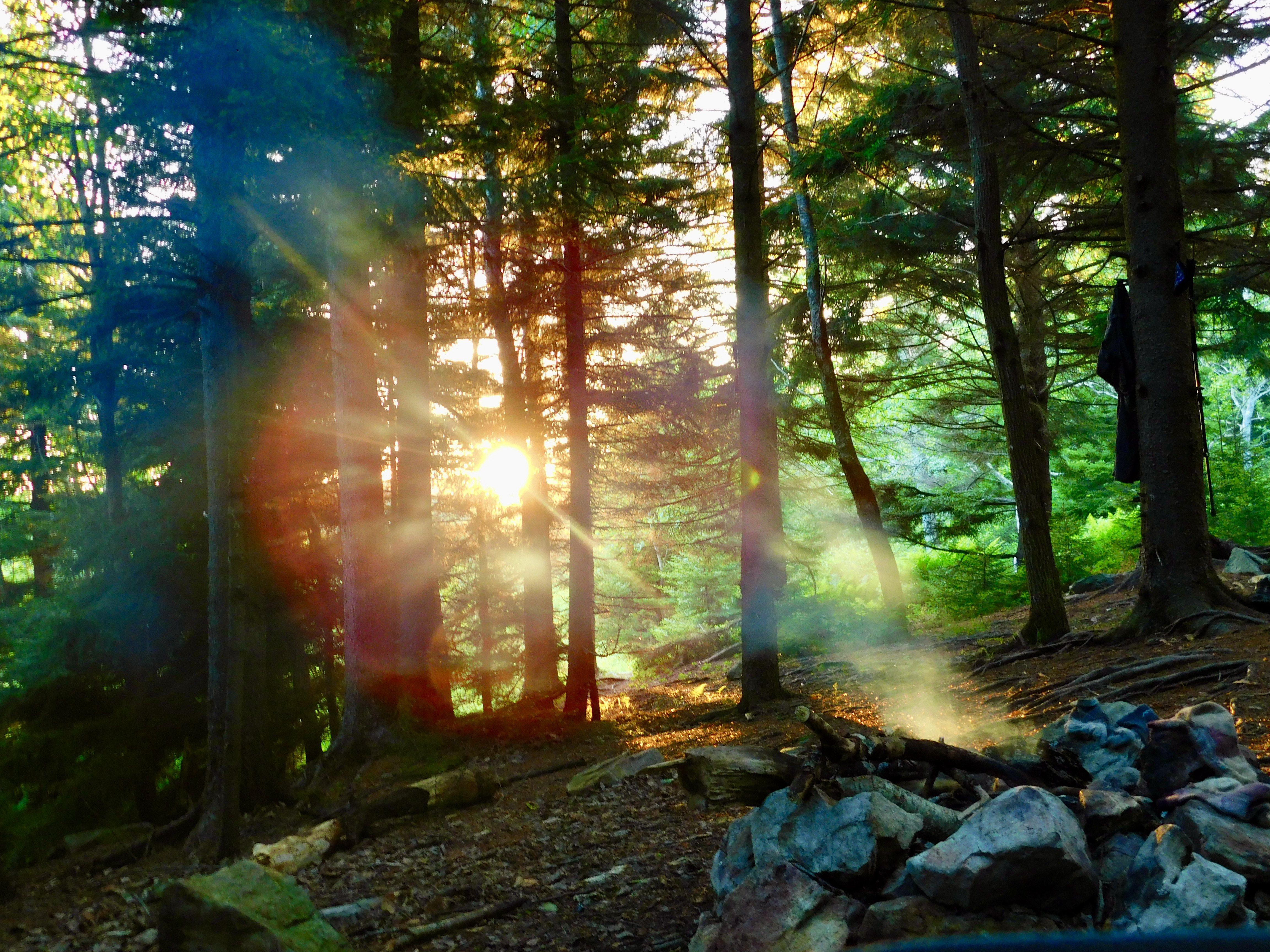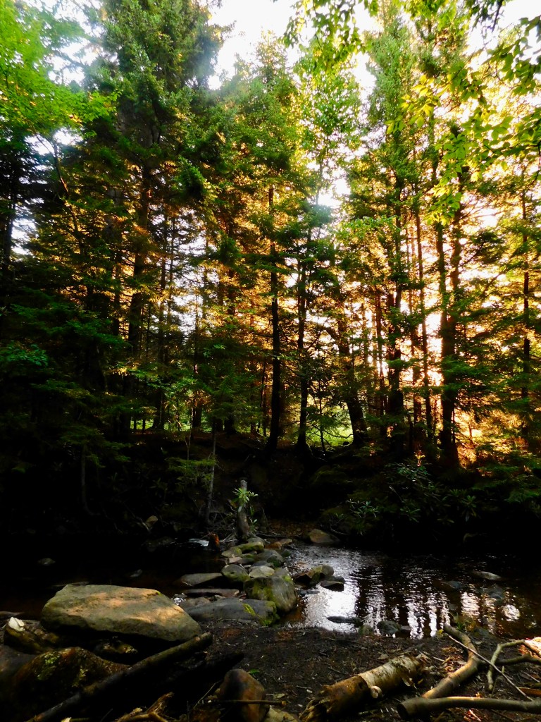 As I mentioned, this was my first time going backpacking, and despite some of the difficulties, I would absolutely go again. The first day on Dobbin’s Grade was incredibly muddy, and we all sank in at some point. I actually got stuck knee-deep in the mud twice and one time lost a shoe – we were able to dig it out. While I don’t hate mud, this was literally a bog, and the mud was like quicksand. I’m incredibly grateful to have gone with family as the fact that we were all struggling made the mud funny rather than dispiriting. To see how troublesome this mud actually was, I really recommend checking out Kristi’s video here, which is a compilation of our falls. Once we’d figured out how to escape the mud, we came to our second problem-solving task of the day: Finding the trail. Apparently at some point in recent history, part of Dobbin’s Grade was rerouted around what appeared to be a beaver-dammed pond in the middle of the old trail. As All Trails did not reflect this change, we had a bit of an adventure to find the new version of the trail to get around the pond. After a bit of stress there, we came to our campsite, which was tucked in among some red spruce trees whose short, lower branches served as excellent places to hang wet clothes while we made camp and washed off in Red Creek nearby. After our dehydrated dinners, we had the trip’s first special treat: A little Jiffy Pop skillet we heated over the fire. So, the first day ended with a beautiful sunset over the trees and handfuls of popcorn around the fire.