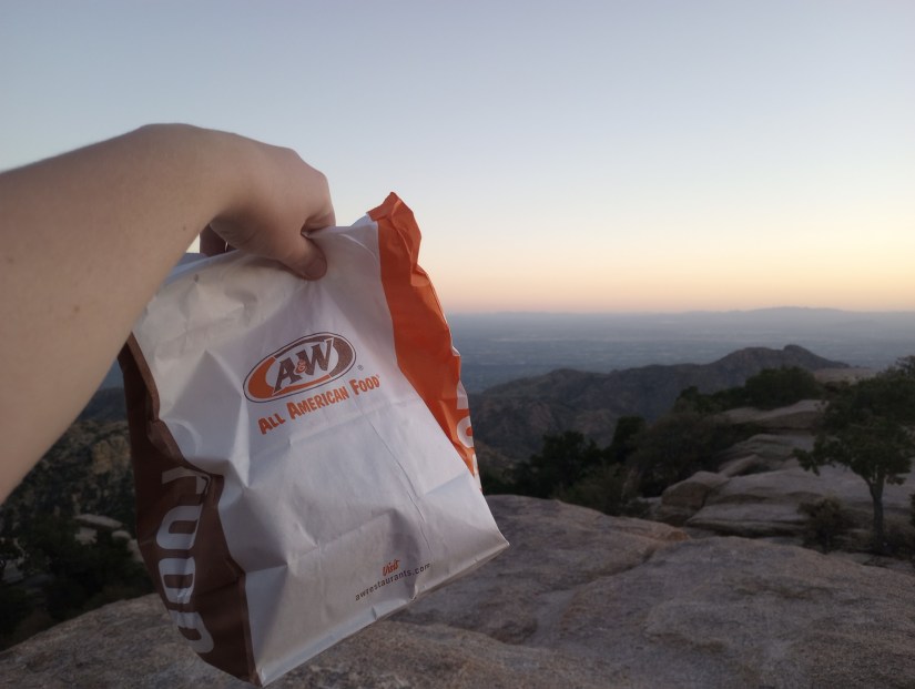 As it turns out, there were a couple of flaws in this plan. First, it’s about an hour drive from A&W to Windy Point where I had planned for us to have our picnic, which meant that the food was kind of cold by the time we got up there. The second problem was that we were there in April, and Mt. Lemmon gets a little chilly in the evenings. We still went up to Windy Point and walked around on the rocks, looked at the city, and ate a few fries. But with the wind blowing and neither of us wearing a jacket, we went back to the car pretty quickly to finish our meal. Still, it was fun and cute, and I was really happy to fulfill this little daydream! It was a really nice way to end our date day in Tucson.